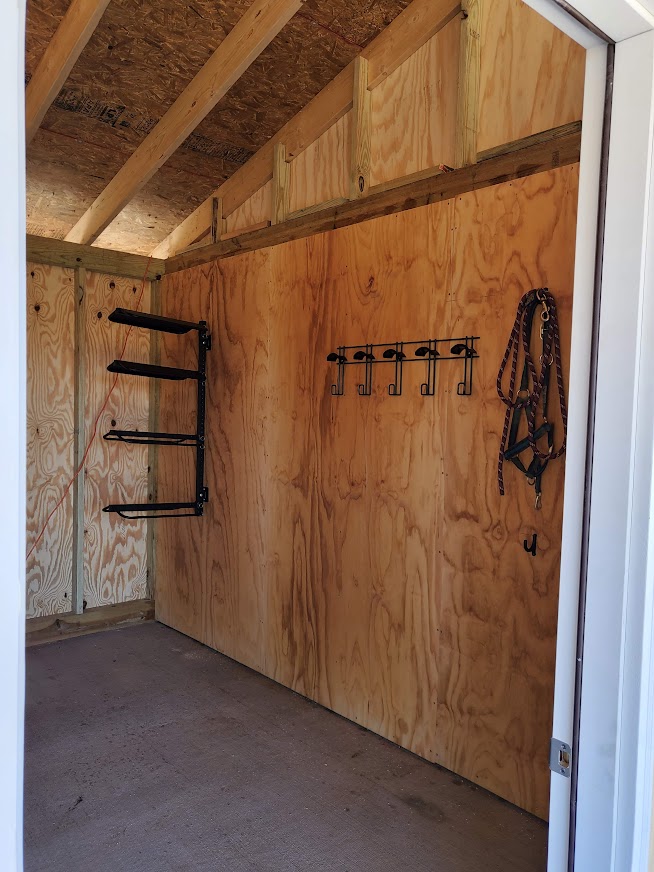 With shedrow boarding, your horse will have their own cozy 10’ x 12’ stall complete with a feeder, hay rack, cross ties, and a fan. Stall bedding is also included in the price, so you don’t have to worry about any extra expenses. Each boarder also has their own tack tote, saddle space, halter and bridle rack for storage.